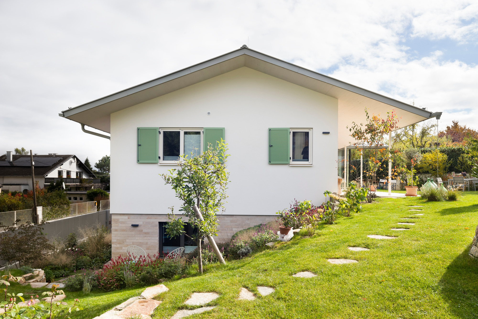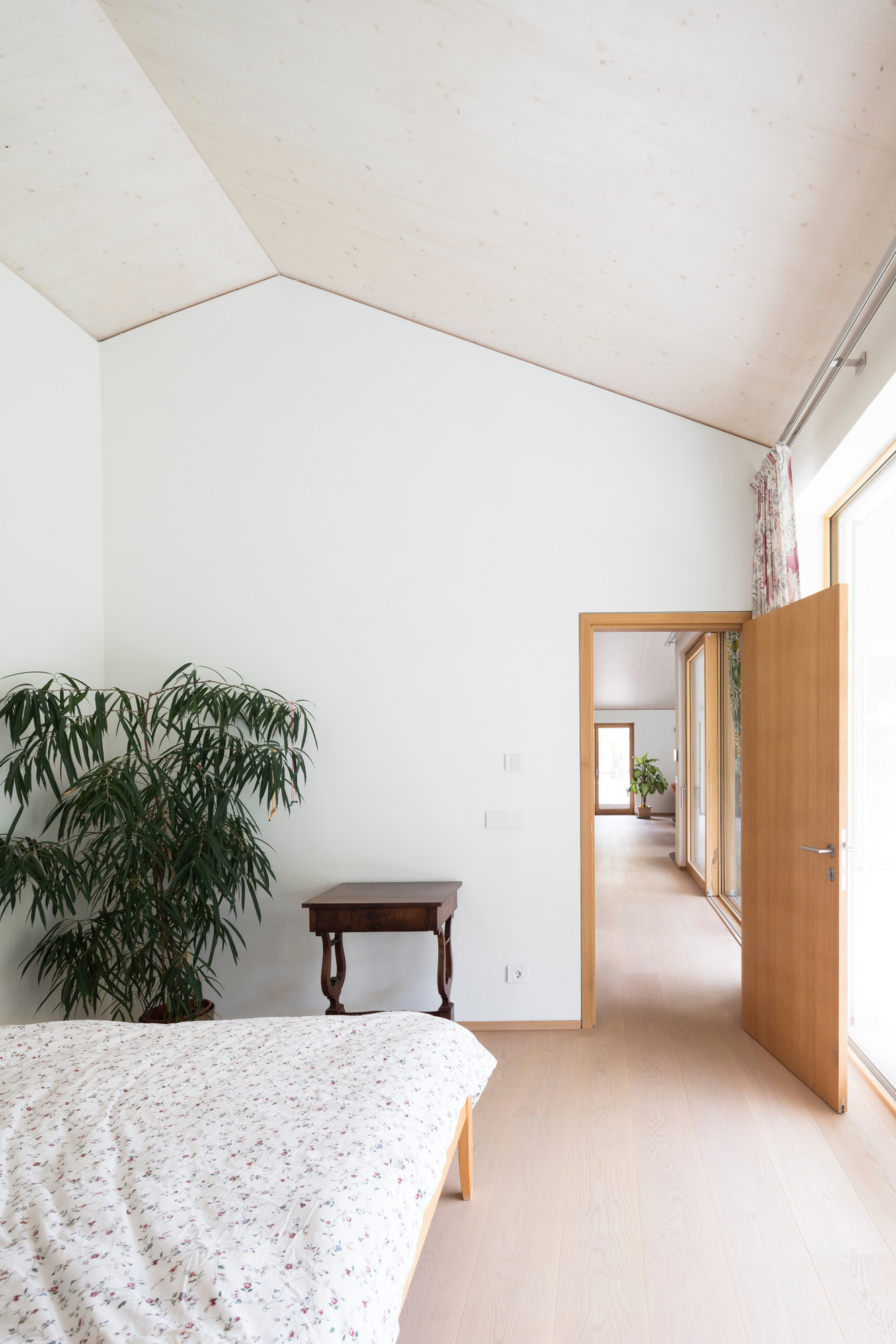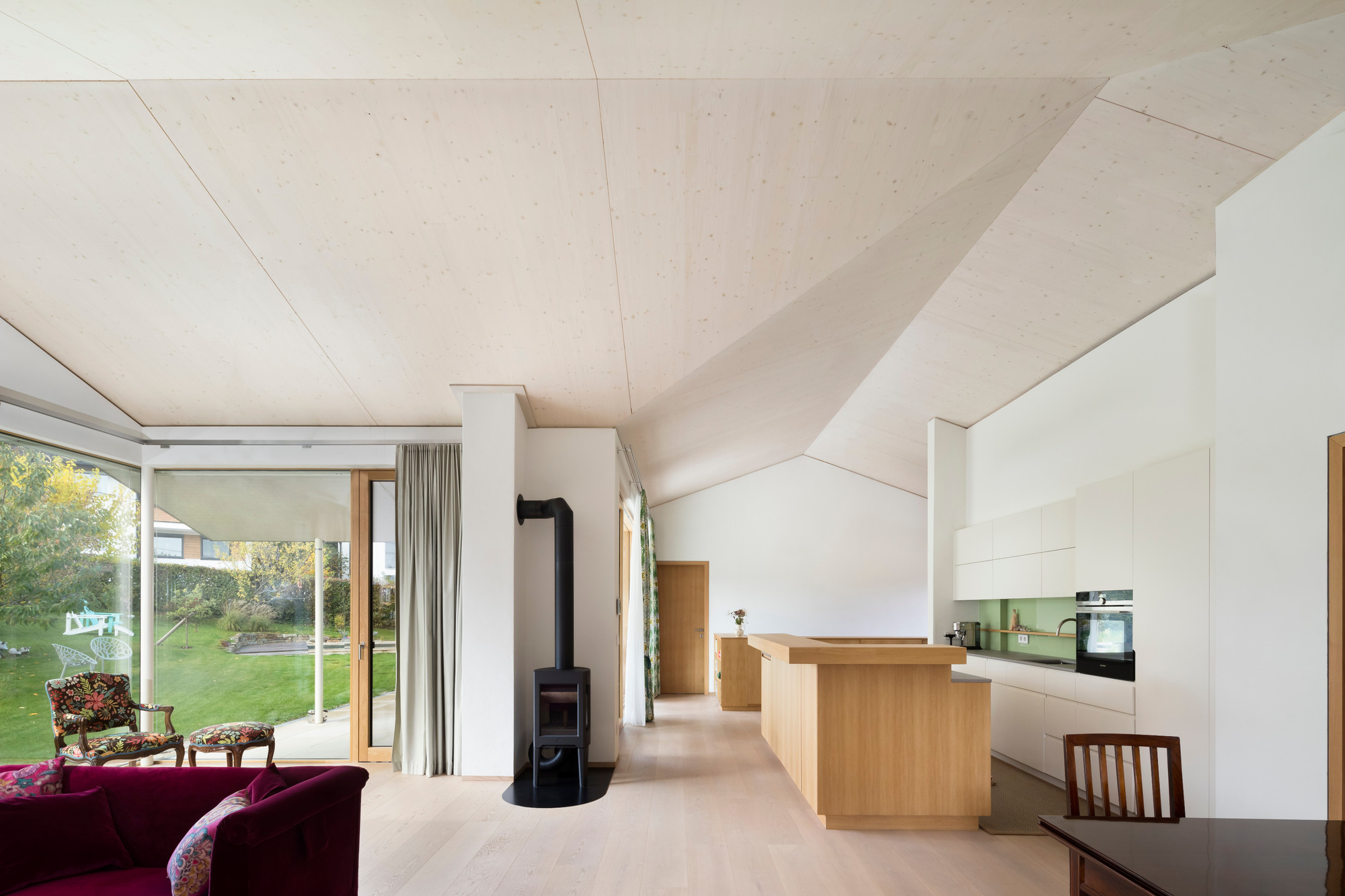 Hinter der schlichten, verputzten Fassade verbirgt sich ein Gebäude, das konsequent in Massivholzbauweise errichtet wurde. Dadurch entfaltet es im Inneren jene warme und einladende Atmosphäre, die für den Baustoff Holz typisch ist. Licht, Material und Proportionen gehen eine harmonische Verbindung ein, die sowohl den Charakter des Ortes als auch die Lebensweise der Bewohnerinnen und Bewohner widerspiegelt.