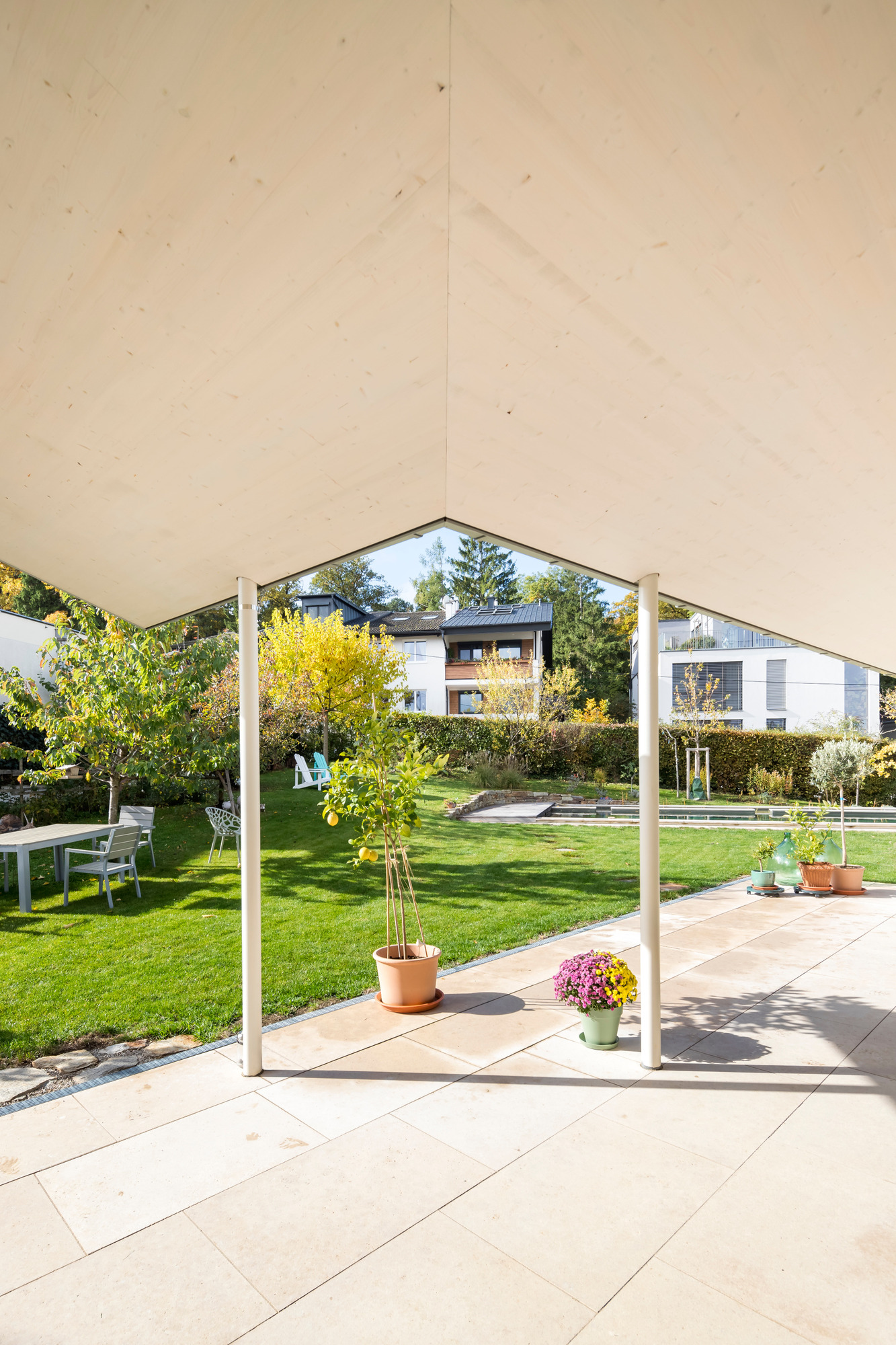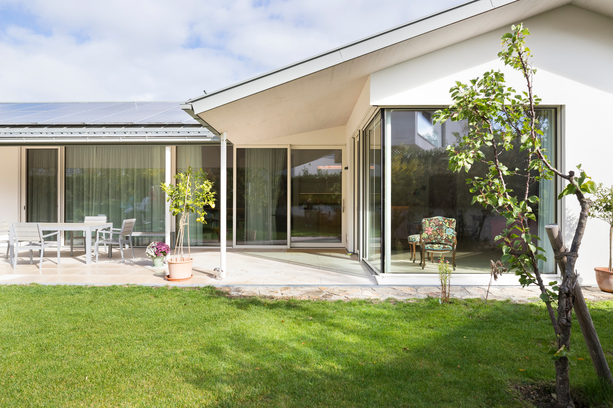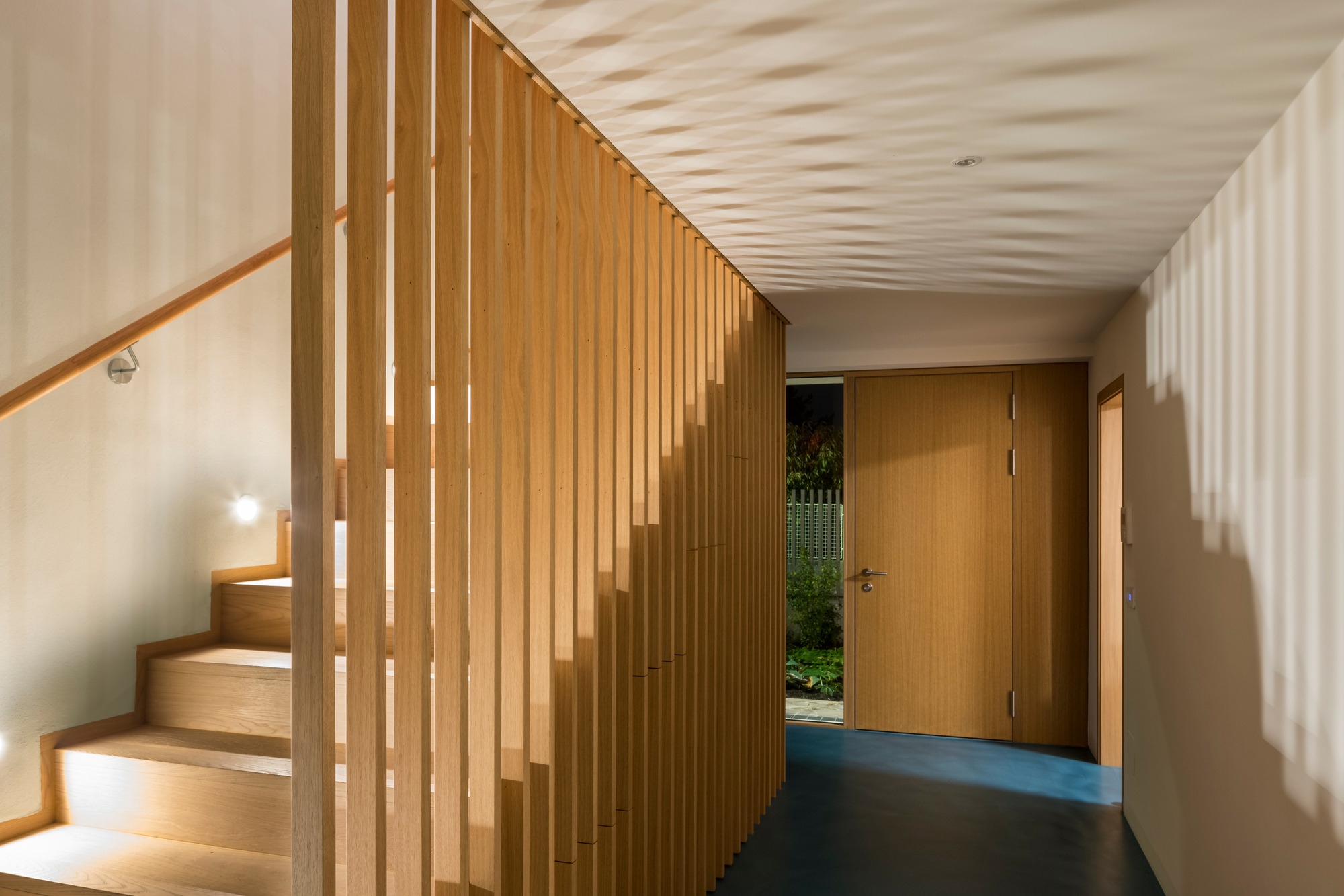Hinter der schlichten, verputzten Fassade verbirgt sich ein Gebäude, das konsequent in Massivholzbauweise errichtet wurde. Dadurch entfaltet es im Inneren jene warme und einladende Atmosphäre, die für den Baustoff Holz typisch ist. Licht, Material und Proportionen gehen eine harmonische Verbindung ein, die sowohl den Charakter des Ortes als auch die Lebensweise der Bewohnerinnen und Bewohner widerspiegelt.