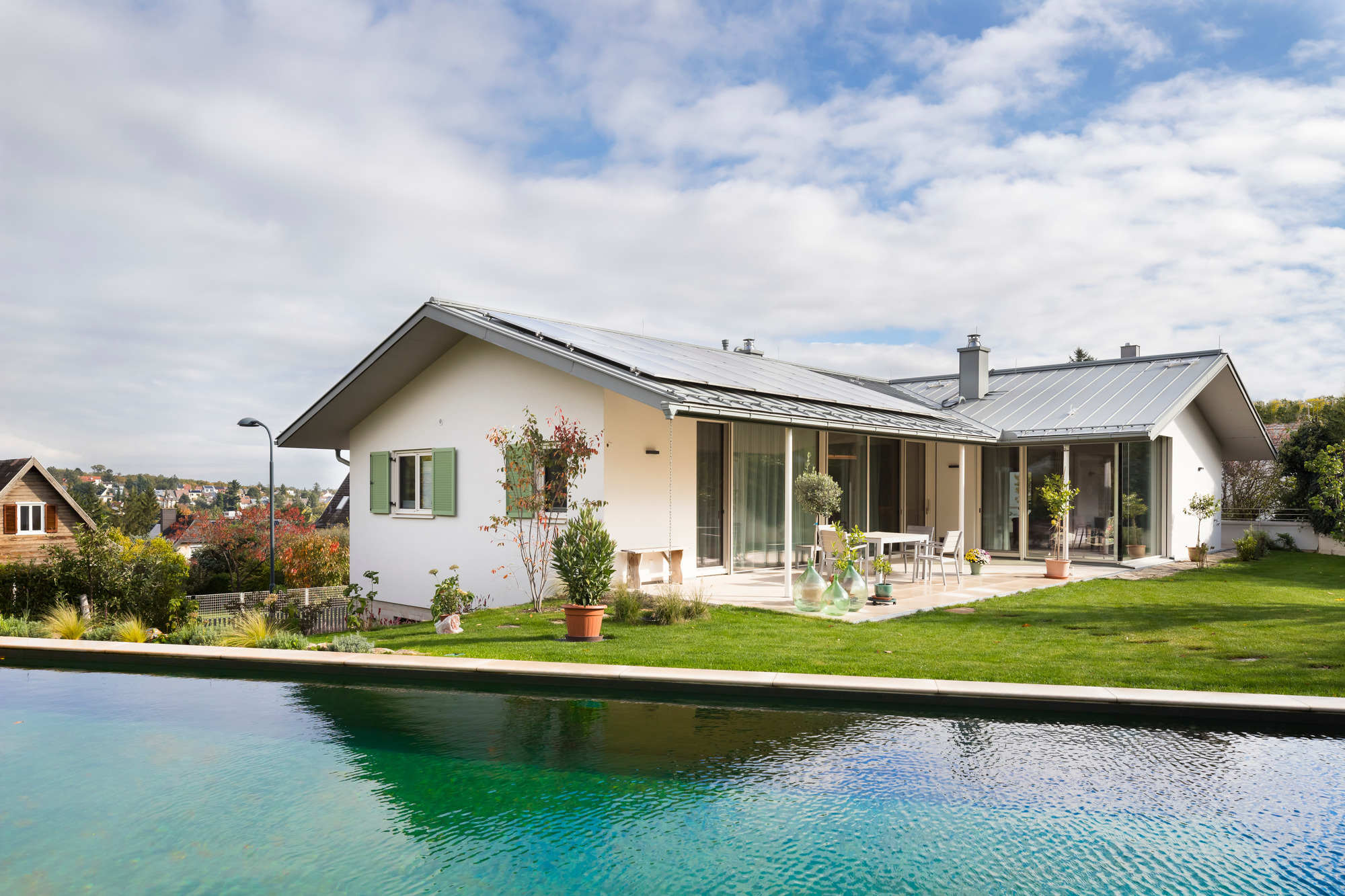 Die Bauleute - eine Yogalehrerin und ein Psychotherapeut - hatten sehr konkrete, über Jahrzehnte gereifte Vorstellungen von Ihrem Wunschhaus: es sollte ein Holzhaus sein, aber man sollte ihm das Holz von außen nicht ansehen.